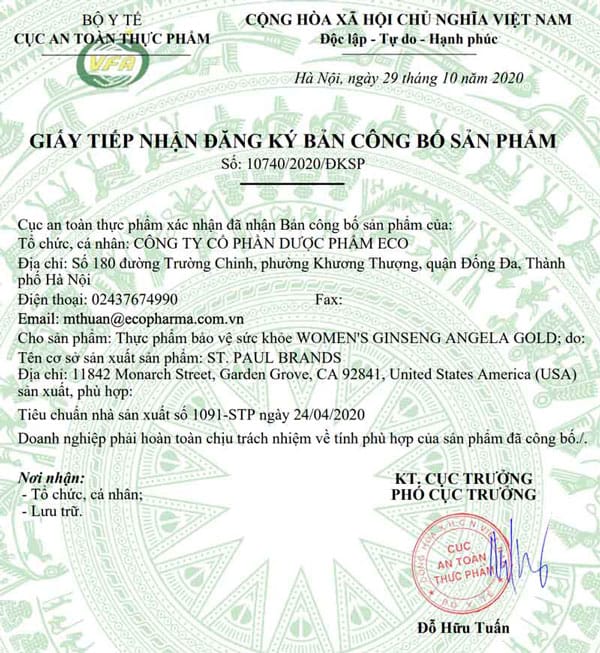 Giấy chứng nhận an toàn sử dụng Angela Gold