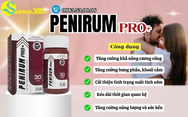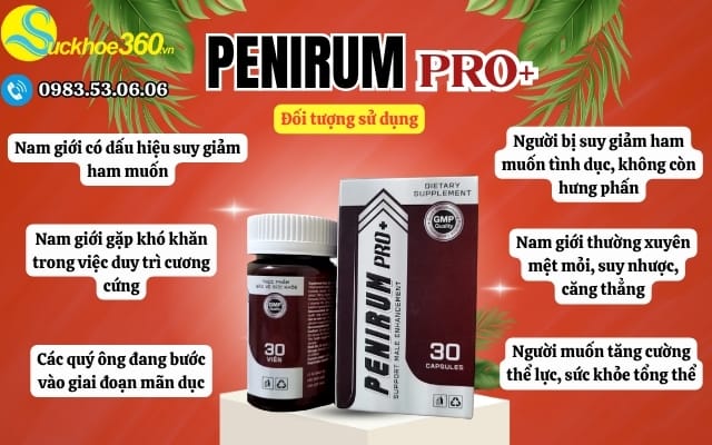 Penirum Pro+ là một thực phẩm chức năng được bào chế để hỗ trợ tăng cường sinh lý nam giới, dựa trên các thành phần tự nhiên và hướng đến việc cải thiện nhiều khía cạnh của đời sống tình dục. Nó có thể trở thành một “trợ thủ” đắc lực cho những ai đang tìm kiếm giải pháp để cải thiện ham muốn, khả năng cương cứng, sức bền và sự tự tin.